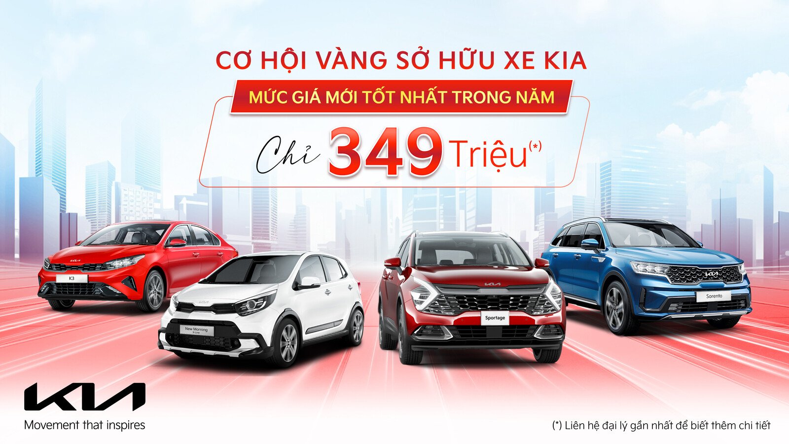 Từ 11/9/2023, Kia áp dụng giá mới với mức điều chỉnh lên đến 75 triệu đồng cho các dòng xe tương đương 50% lệ phí trước bạ. Theo đó, cùng với chính sách giảm 50% trước bạ từ chính phủ và chương trình ưu đãi mới của Kia Việt Nam, khách hàng có cơ hội tốt nhất trong năm để sở hữu các dòng xe Kia thế hệ mới với ưu đãi tương đương 100% lệ phí trước bạ. Chương trình được áp dụng tùy theo dòng xe và phiên bản.